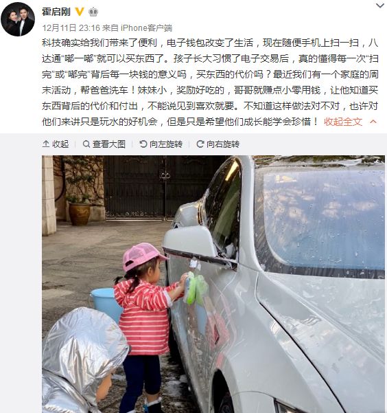 之前霍启刚不止一次在微博中晒出自己两个孩子在干活的照片。